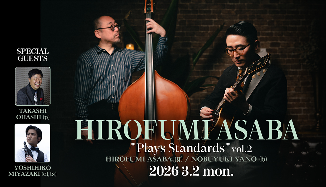 アルバム『Barney Kessel 100th Anniversary Live at Cotton Club』も大好評。ジャズギターの伝統的なスタイルを極める浅葉裕文が1年ぶりにコットンクラブ公演を開催する。14歳からギターを始め、20歳から世界各地を旅して演奏。コンスタントにアルバムを発表しながら、Ralph Lauren、J.M. Weston、白山眼鏡などのアパレルブランドともコラボレーションし、Fritz HansenとFragment Design(藤原ヒロシ)による「A stool for guitarists」のプロモーションビデオでもオリジナル楽曲を披露している。今回のステージでは、大橋高志 (p)と宮崎佳彦 (cl,ts)の2人をゲストに迎え、YouTubeチャンネルの好評企画<Plays Standards>をオーディエンスの前で展開するプロジェクトの第2弾。時代を超えて愛されてきた数々のスタンダード・ナンバーが、極上の解釈でここに蘇る。