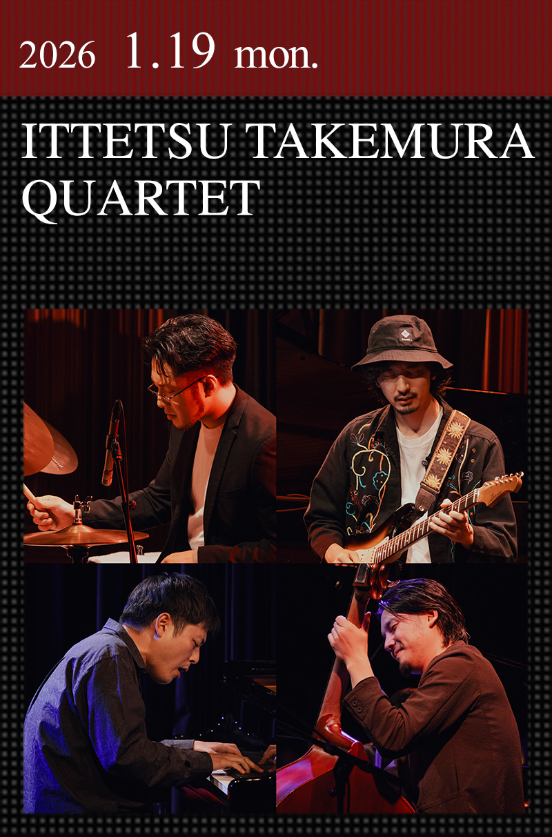 渡辺貞夫グループ、峰厚介カルテット、藤井郷子Tokyo Trio等、数々のユニットで活動する俊英ドラマーの竹村一哲が、自身のカルテットを率いて1年3か月ぶりに登場する。2005年、中学卒業と同時にプロ活動を開始。翌年、石田幹雄トリオで出場した「横濱 JAZZ PROMENADE 2006」のジャズ・コンペティションで、グランプリと市民賞をダブル受賞。2010年に渡辺貞夫のツアーに初参加し、2019年には同世代の魚返明未(p)、井上銘(g)、三嶋大輝(b)と共に竹村一哲カルテットを結成。これまで『村雨』、『陽炎』とアルバム2作品をリリースしている。同世代が集まった不動のメンバーで、スリリングな音楽世界を探求し続ける竹村一哲。今回はどんな音作りでオーディエンスを引き込んでくれるのだろうか。