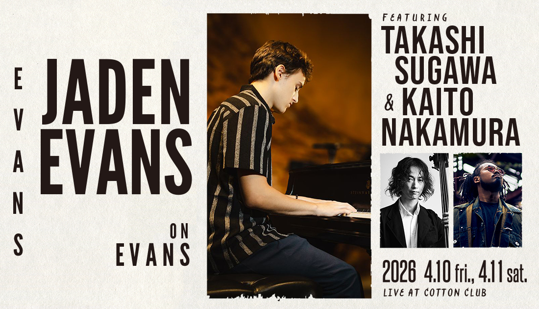 ジャズ・ピアノの神格、ビル・エヴァンスを祖父に持つ18歳。要注目の若手ピアニスト、ジェイデン・エヴァンスが遂に初来日公演を開催する。6歳からピアノの正式な訓練を始め、母親のミシェル・エヴァンスからクラシック楽譜の読み方、ジャズチャートの理解、即興演奏の基礎を学習。ジャズバンドには中学時代から参加し、ノースカロライナ州のイーロン大学ジャズ・フェスティバルでは優秀ソリスト賞を受賞した。祖父へのトリビュート・アルバム『Evans on Evans』ではヴィセンテ・アーチャー、マーカス・ギルモアを迎えて「Waltz For Debby」、「Time Remembered」、「Very Early」などをプレイ。今回の公演ではこれら不朽のエヴァンス・ナンバーの数々を、須川崇志、中村海斗とのトリオで演奏する。