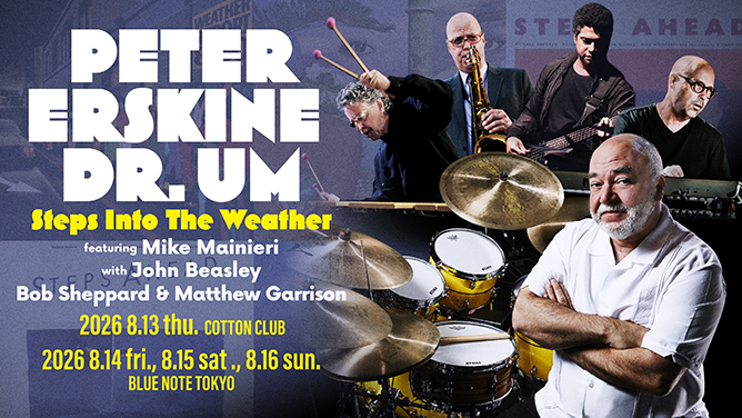 700点以上のレコーディングやサウンドトラックに携わってきたスーパー・ドラマー、ピーター・アースキンが、Dr. UM (ドクター・アム)バンドを率いて登場する。4歳でドラムを始め、メイナード・ファーガソン・オーケストラ在籍後、ウェザー・リポートでジャコ・パストリアスと鉄壁のリズム・セクションを構成。その後もステップス・アヘッド、スティーリー・ダン、自身のユニット等で精力的な活動を続けている。"Dr. UM"は、ウェザー・リポートやステップス・アヘッド時代のフュージョン、R&Bのドラムスタイルに立ち返った、アースキンの原点回帰プロジェクト。今回の公演には、マイク・マイニエリ、ボブ・シェパード、ジョン・ビーズリー、マシュー・ギャリソンというレジェンドたちが集結、伝説を蘇らせる。