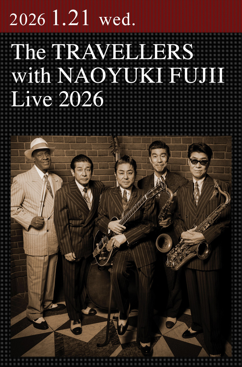 福岡・久留米を拠点に、国内はもとより米西海岸ツアーやイギリスツアーなど海外まで名を轟かせるスウィング/ジャンプ・ブルース・バンド、The TRAVELLERSと藤井尚之が3年連続でニュー・イヤー・ライヴを開催する。The TRAVELLERSは1998年に本格的な活動を開始し、同年7月に1stシングル「TRAVELLERS」をリリース。クールでパワフル、そしてダンサブルなサウンドで、音楽に国境がないことを証明してきた。藤井尚之(ex.チェッカーズ)は、共通の音楽的ルーツを持つ盟友として、2011年の共演アルバム『RUBBER TOWN』以来、定期的に共演を重ねている。ダブルテナーの迫力、同郷ならではのグルーヴ感には、ますます磨きがかかっている。黄金のコンビネーション、唯一無二のライヴ・パフォーマンスを満喫したい。