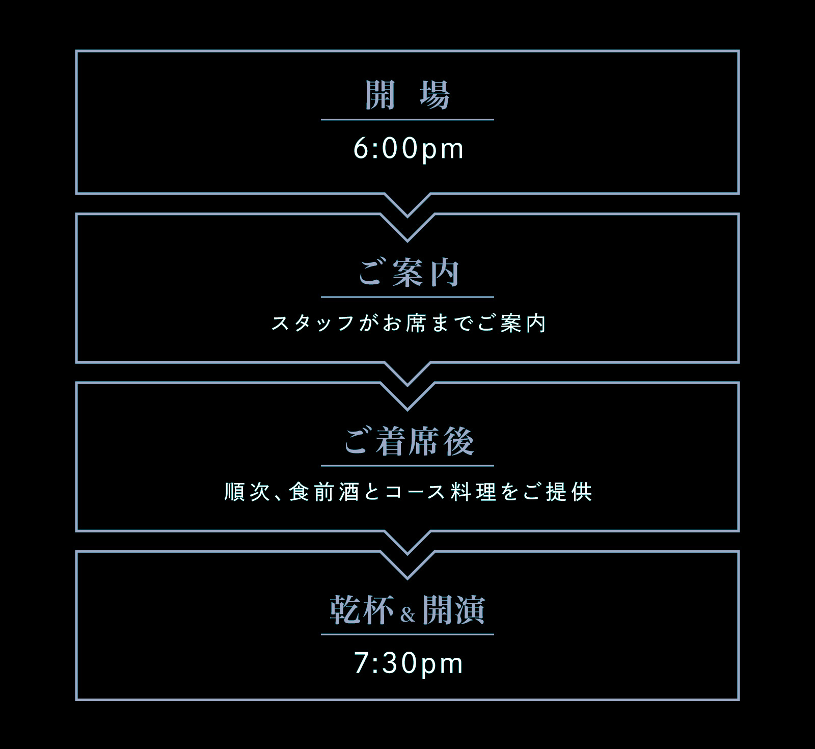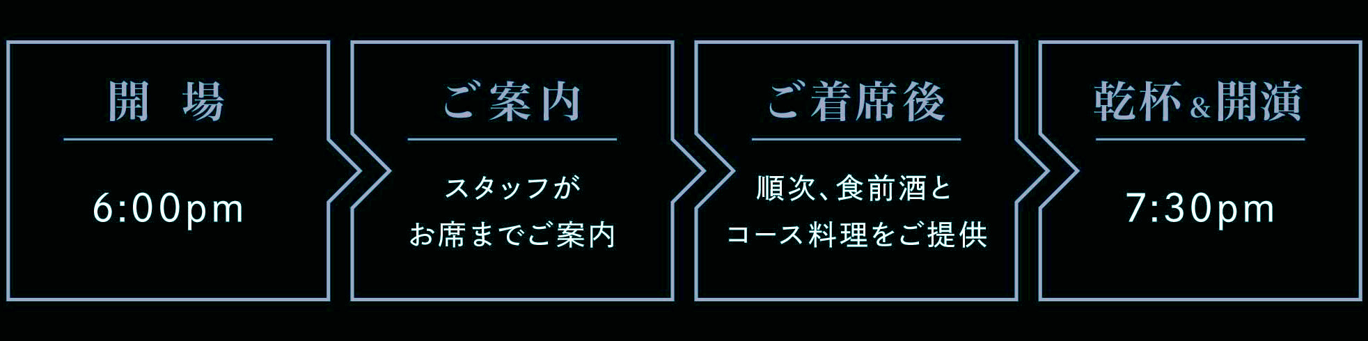 晩餐会をより快適にお過ごしいただくため、タイムテーブルをご用意いたしました。