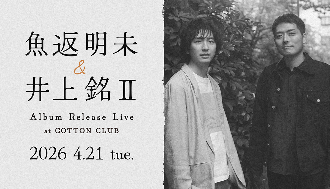 新世代ジャズ・シーンの旗手ふたりが約3年半ぶりにデュオで登場!ピアニストの魚返明未とギタリストの井上銘が、約4年ぶりとなるデュオ・アルバム『魚返明未&井上銘 Ⅱ』のリリースを記念した東京公演を開催する。⿂返明未は、東京藝術大学音楽学部作曲科在学中の2015年に初リーダー作『Steep Slope』をリリース。数多くのグループで活躍するほか、映画音楽にも手腕を発揮している。井上銘は高校在学中にプロとしてのキャリアをスタートさせ、2011年に『First Train』でメジャー・デビュー。STEREO CHAMPやCRCK/LCKSをはじめ、多くのバンドやプロジェクトで活躍を続けている。ジャズを基調としながらも映画音楽を彷彿させるテーマ、ドキュメンタリー映像が浮かぶようなメロディー、雄大かつ繊細なインプロヴィゼーション。二人が織りなすドラマティックかつ静謐さに満ちたテーマ&アンサンブルが聴くものを理想郷へと誘う。