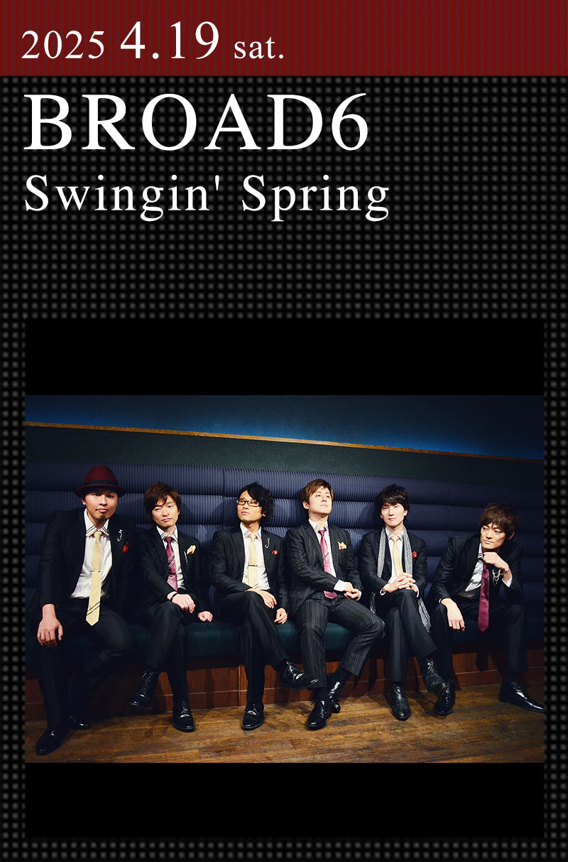 男性6人で5オクターブの音域を駆使。アカペラでジャズ・コーラスを届けてきたBROAD6がコットンクラブにふたたび登場!RAG FAIRとINSPiのジャズ・コーラス・フリークが意気投合して2010年に結成。ライヴを軸に活動を開始し、フェスやイベントでも注目を浴び、アカペラの魅力にあふれたパフォーマンスでジャズ・ファンだけでなく多くのオーディエンスを虜にしてきた。いつも趣向を凝らしたテーマで、選りすぐりのレパートリーを披露してきたBROAD6。今回は、春の訪れにふさわしい選りすぐりのレパートリーを携え、温かく心弾むステージを披露予定だ。心を満たす極上のアカペラ・コーラスが、心地よい春の夜に響き渡る。