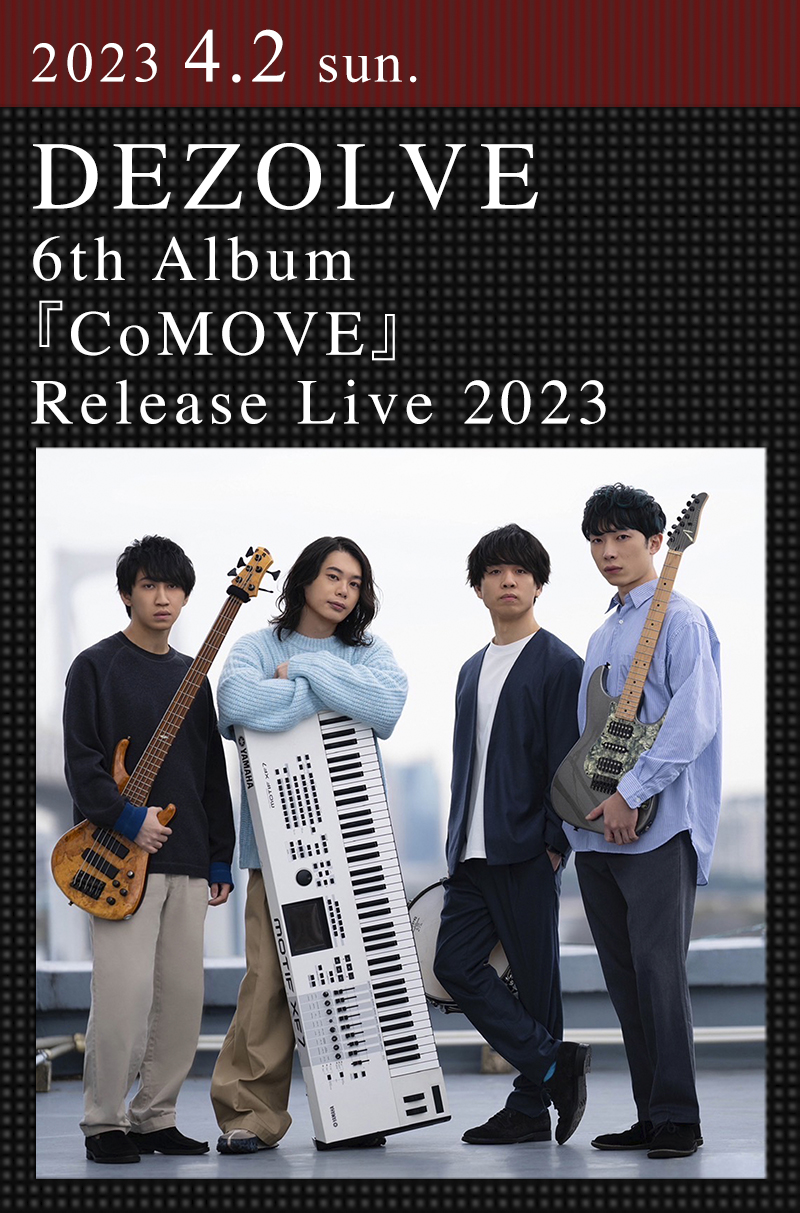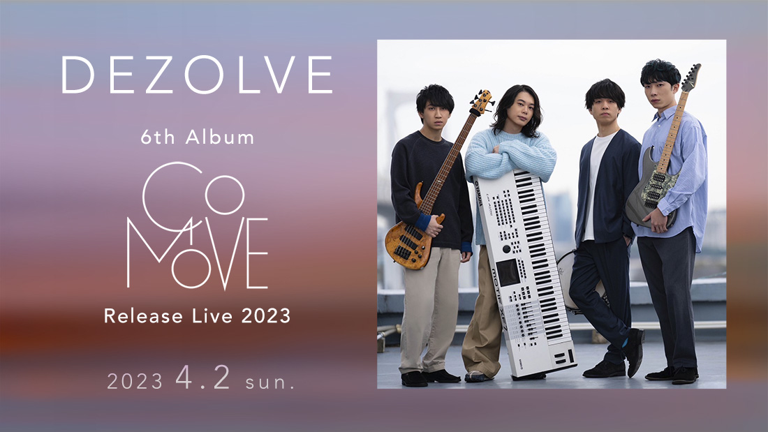 この2月にニューアルバム『CoMOVE』を発表。圧倒的な実力とセンスで幅広い層の音楽ファンから支持されている人気インストゥルメンタル・バンド、DEZOLVEが約1年ぶりにツアーファイナルで登場する。山本真央樹(ds)と友田ジュン(key)を中心に2014年に結成され、15年に北川翔也(g)が参加。2022年11月からは兼子拓真(b)が正式メンバーとして加わり、よりパワーアップした再始動の決意と、より深みを増した世界観を約3年ぶりのリリースとなる『CoMOVE』に注ぎ込んだ。各メンバーがジャズをはじめ、ロックやポップス、ゲーム音楽など、幅広い分野でプレイヤー/コンポーザーとして活躍するDEZOLVE。従来のジャズ・フュージョンの枠にとどまらないオリジナルな表現の数々を、至近距離で体感したい。