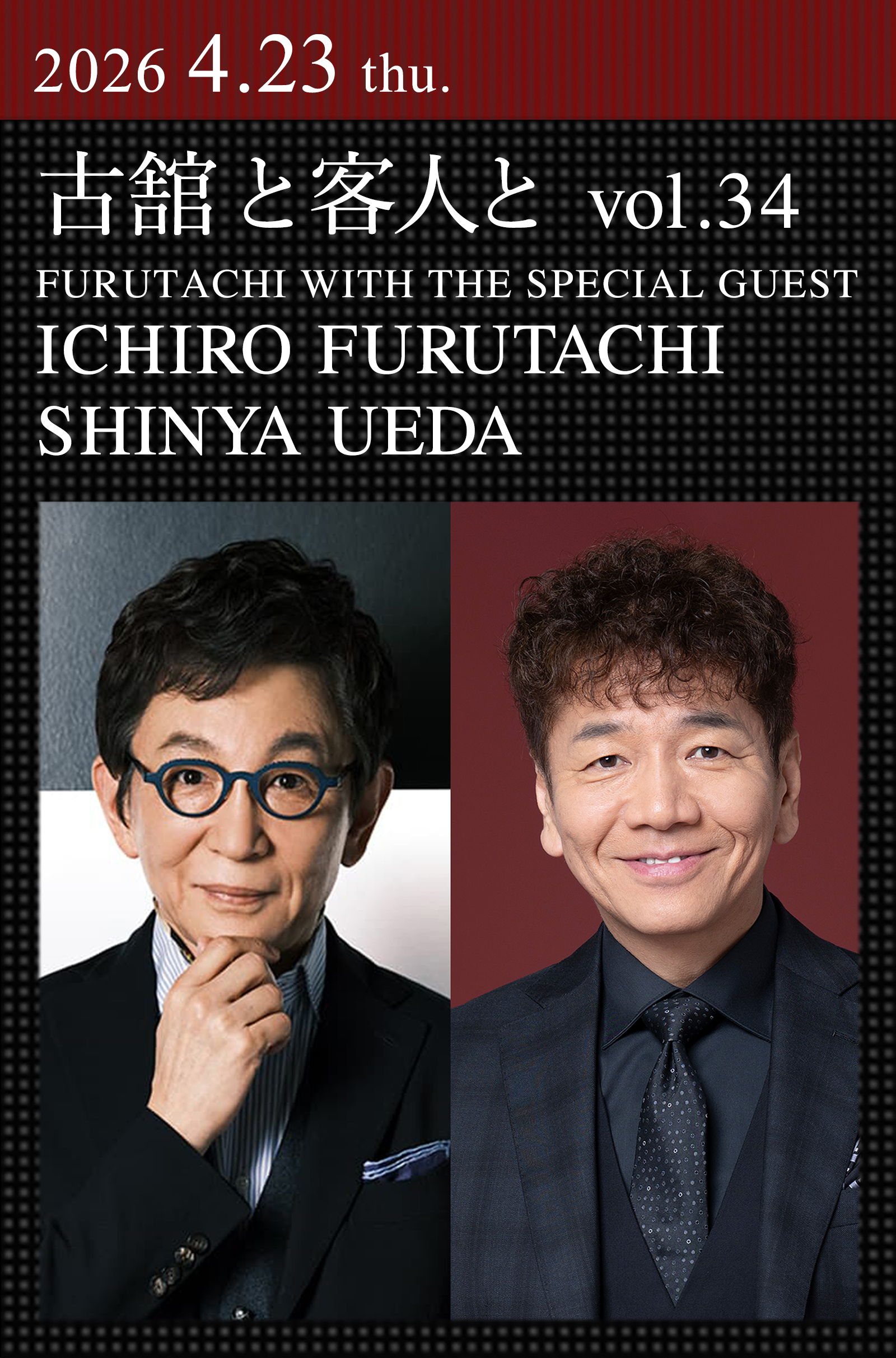 マイク一本で一人語りをする“トーキングブルース”など、「喋り屋」として確固たるポジションを築いてきた古舘伊知郎。2023年6月に新宿でスタートしたトークライヴ「古舘と客人と」が場所を移し、丸の内コットンクラブでの開催は26回目となる。今回は、お笑い芸人の上田晋也を迎えて、大いに語り合う。台本なし、演出なし、いわばオーディエンスの前でのプライベートトーク。古舘伊知郎がいま話したい人をゲストに迎え、サシで語り合う、その日・その時限りのプレミアムな雑談を、ぜひご一緒に!