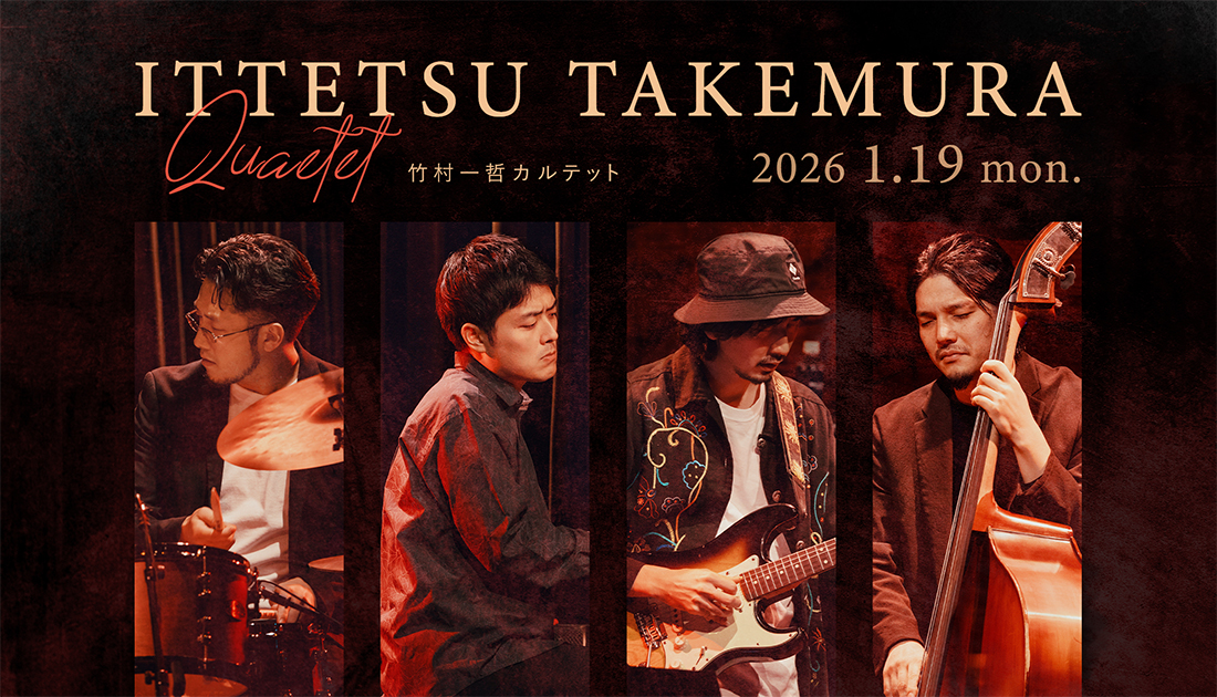 渡辺貞夫グループ、峰厚介カルテット、藤井郷子Tokyo Trio等、数々のユニットで活動する俊英ドラマーの竹村一哲が、自身のカルテットを率いて1年3か月ぶりに登場する。2005年、中学卒業と同時にプロ活動を開始。翌年、石田幹雄トリオで出場した「横濱 JAZZ PROMENADE 2006」のジャズ・コンペティションで、グランプリと市民賞をダブル受賞。2010年に渡辺貞夫のツアーに初参加し、2019年には同世代の魚返明未(p)、井上銘(g)、三嶋大輝(b)と共に竹村一哲カルテットを結成。これまで『村雨』、『陽炎』とアルバム2作品をリリースしている。同世代が集まった不動のメンバーで、スリリングな音楽世界を探求し続ける竹村一哲。今回はどんな音作りでオーディエンスを引き込んでくれるのだろうか。