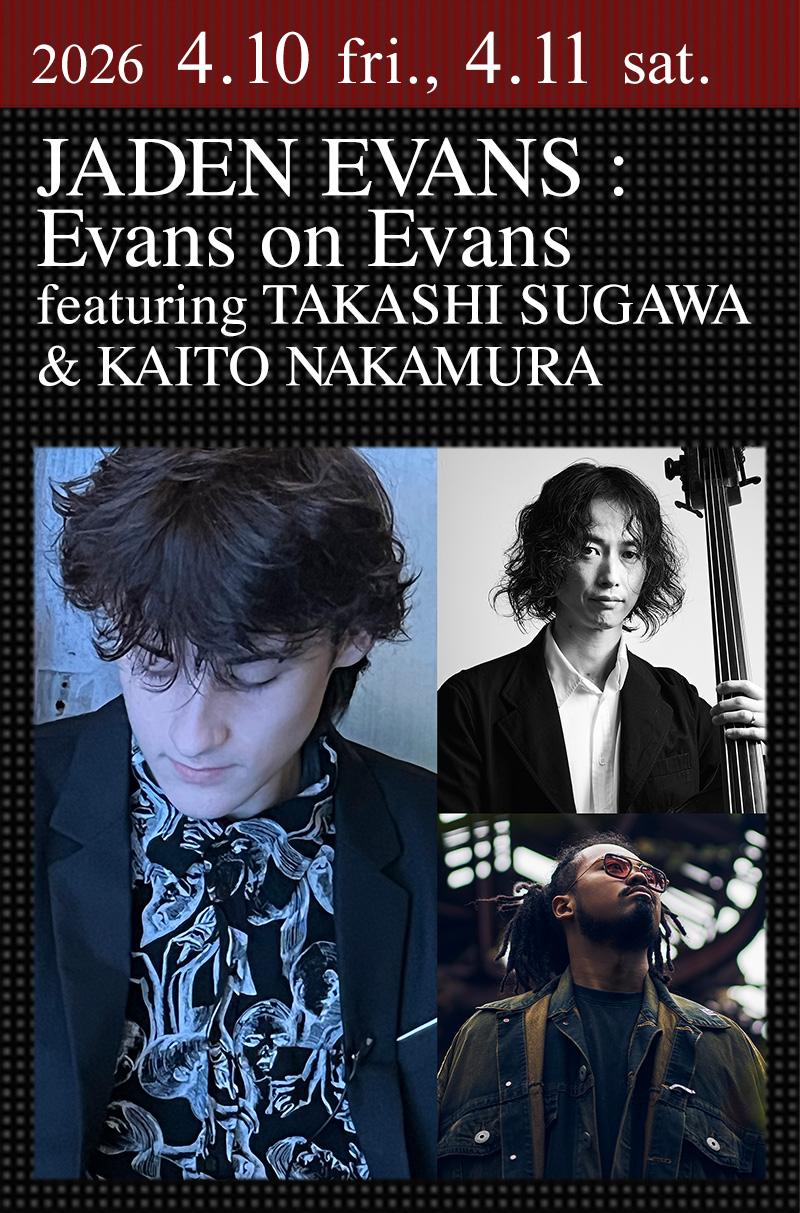 ジャズ・ピアノの神格、ビル・エヴァンスを祖父に持つ18歳。要注目の若手ピアニスト、ジェイデン・エヴァンスが遂に初来日公演を開催する。6歳からピアノの正式な訓練を始め、母親のミシェル・エヴァンスからクラシック楽譜の読み方、ジャズチャートの理解、即興演奏の基礎を学習。ジャズバンドには中学時代から参加し、ノースカロライナ州のイーロン大学ジャズ・フェスティバルでは優秀ソリスト賞を受賞した。祖父へのトリビュート・アルバム『Evans on Evans』ではヴィセンテ・アーチャー、マーカス・ギルモアを迎えて「Waltz For Debby」、「Time Remembered」、「Very Early」などをプレイ。今回の公演ではこれら不朽のエヴァンス・ナンバーの数々を、須川崇志、中村海斗とのトリオで演奏する。