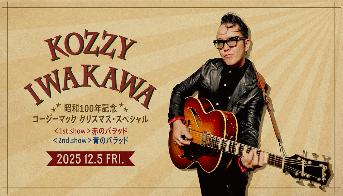 屈指のメロディ・メーカー、KOZZY IWAKAWAこと岩川浩二が、一足早いクリスマスライブを開催する。昭和63年のデビュー以来、“ROLLIE”“ザ・コルツ”“ザ・マックショウ”からソロワークまで、ロックンロールの世界を縦横無尽に渡り歩き、昭和99年に『赤のバラッド』、本年・昭和100年には『青のバラッド』と、独唱アコースティック・バラッド集をKOZZY MACK from THE MACKSHOW名義で発表。コロナ前まで毎年「クリスマスディナーショー」と題して開催していたイベントを、今回は特別に復活。Yama-chang & JOHNNY、ブギウギ・ケンタロー、UC、TOMOKI、AKIRAといった仲間たちに加え、スペシャル・ゲストとしてバイクボーイ from ザ・マックショウを迎え、“コージー・ワールド”の魅力をたっぷり届ける。