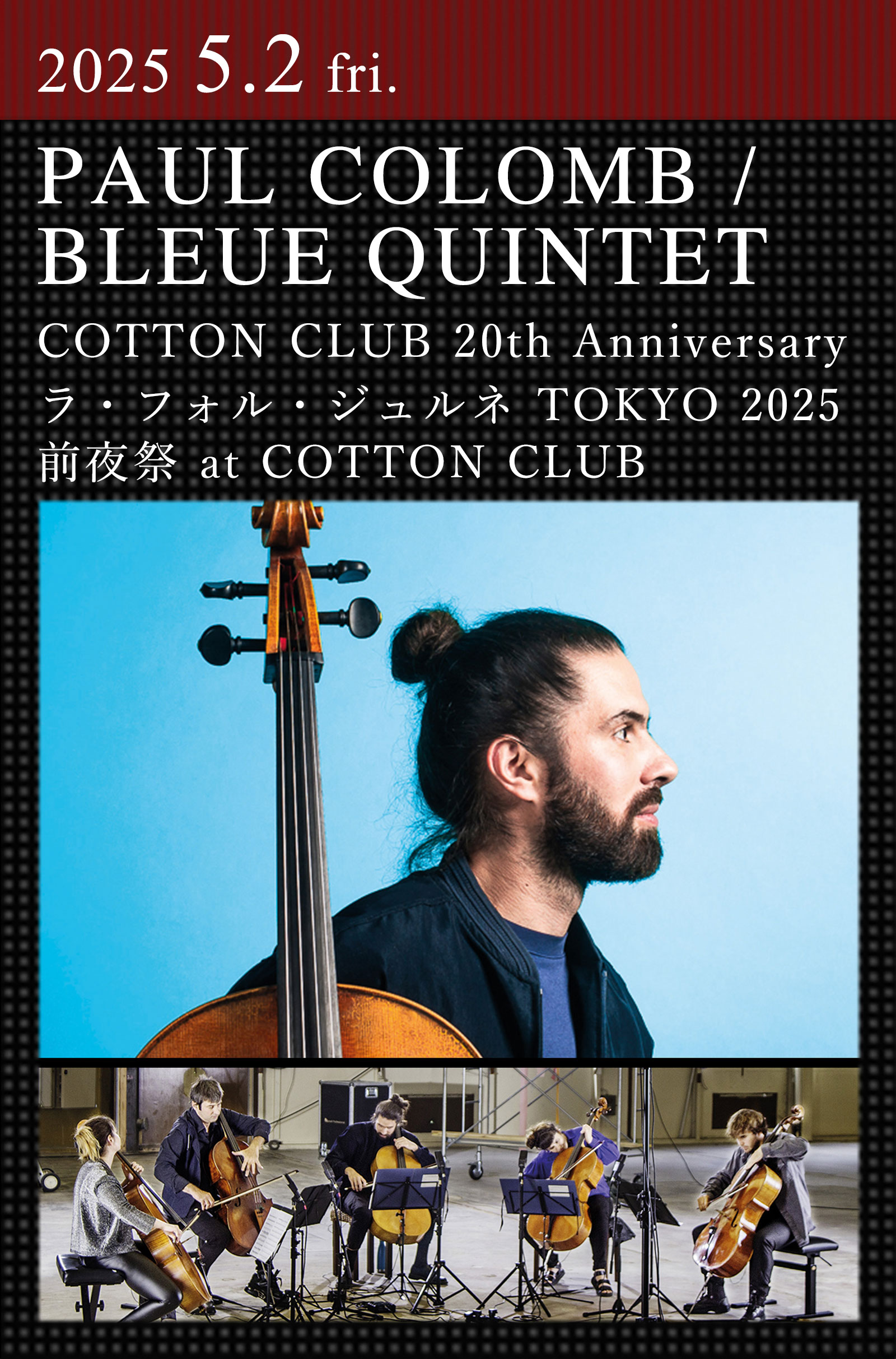 毎年ゴールデンウィークに東京国際フォーラム周辺で開催される、世界最大級のクラシック音楽祭「ラ・フォル・ジュルネ」とコットンクラブが、初の共同企画を実施する。題して「COTTON CLUB 20th Anniversary ラ・フォル・ジュルネ TOKYO 2025 前夜祭」。出演は、2022年に創設された実験精神あふれるチェロ五重奏団 ポール・コロン/ブルー・クインテット。リーダーのポール・コロンはフランス出身で、スイス・ローザンヌ音楽院にてフランソワ・サルクに師事。インド・バンガロール音楽学校で教鞭をとった経験を持つ、気鋭のチェリスト/作曲家/編曲家である。ステージでは、話題作『Bleue Quintet』(Mirare)からの楽曲を中心に、伝統的な室内楽と電子音楽を融合させた独創的な音楽世界を展開する。スペシャルゲストとして、大林武司 (p) の参加も決定!この日だけの特別なコラボレーションをお楽しみください。