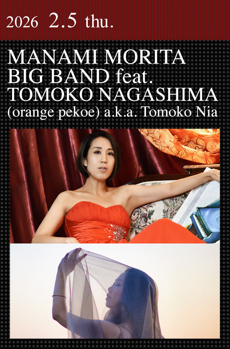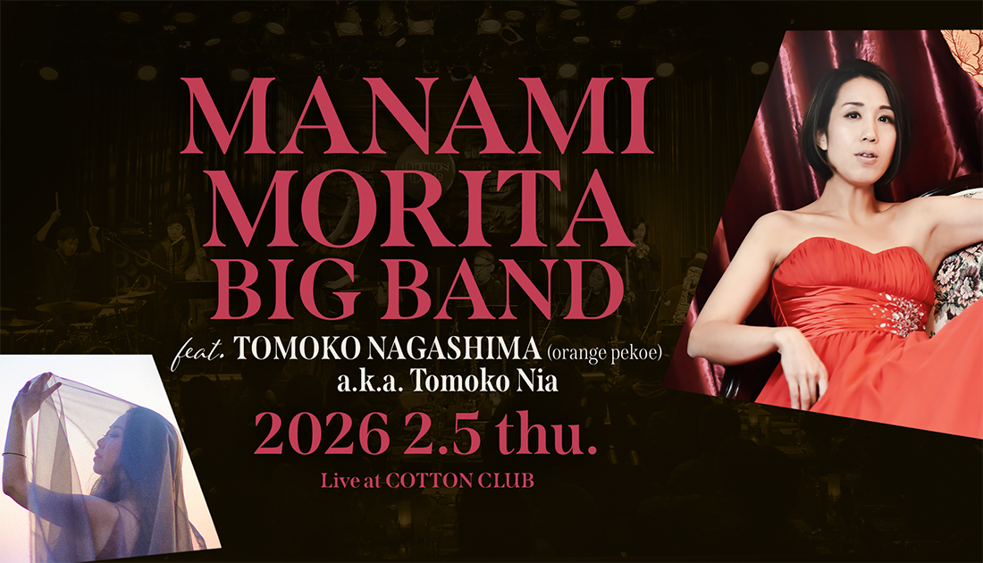 ピアニスト/コンポーザーの森田真奈美が4年連続で登場!今回は全ての作編曲を手がける自身のビッグバンドに、orange pekoeのナガシマトモコを迎えたスペシャルライヴとなる。森田は米国バークリー音楽院在学中から数々の賞を受賞。エスペランサ・スポルディングなど世界的ミュージシャンとも共演し、テレビやラジオ番組のテーマ曲、サウンドトラックなども手がけて現在に至っている。ナガシマトモコは1998年に藤本一馬とorange pekoeを結成し、2002年メジャーデビュー。現在まで7枚のオリジナルアルバムをリリースし、26年のラストライヴをもって活動満了予定。このコットンクラブ公演では森田のオリジナルやアレンジに加え、orange pekoeの名曲やジャズスタンダードをナガシマが歌い上げる。