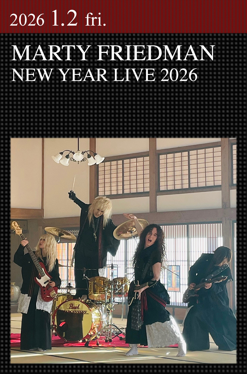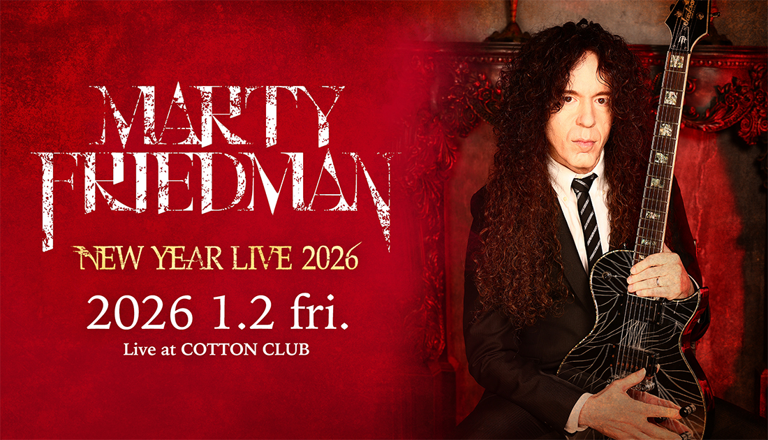アルバム『ドラマ 軌跡 』がロングセラーを続ける、最高峰のギタリストでありマルチアーティストとして、日本と世界をつなぐ架け橋であり続けるマーティ・フリードマンが、大晦日~元日のカウントダウン・イベントに続き、2026年の一発目を飾る公演「MARTY FRIEDMAN NEW YEAR LIVE 2026」をコットンクラブで開催する。メンバーはもちろん、セカンド・ギタリストに森丘直樹、ベースに“わかざえもん”、ドラムに“CHARGEEEEEE”という気鋭技巧派メンバーを迎えた鉄壁のラインナップ。不動の顔ぶれで全米ツアーをはじめ数々のツアーを成功させてきた彼らが繰り広げる火花散るギター・バトルと、一糸乱れぬバンド・アンサンブルを至近距離で体感したい。2026年最初の衝撃はここにある。