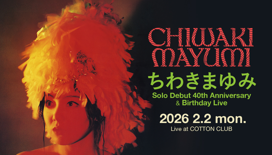 去る10月、西麻布〈RED SHOES〉で開催されたソロ・デビュー40周年アニバーサリー・ライヴは即日ソールドアウトに。現在はラジオDJやイベントMCとして活躍するほか、さまざまなアーティストのゲスト・ヴォーカルとしてライヴやレコーディングにも参加している、ちわきまゆみが、自身の誕生日当日にあたる2月2日、ついにコットンクラブ初登場を果たす。大学在学中にバンド活動を始め、テクノポップ・バンドのヴォーカリストを経て、1985年にファースト・ソロ・シングル「Good Morning I Love You」をリリース。2025年10月15日より、EMI在籍時代にリリースされた全カタログがデジタル配信中だ。バンド・メンバーには、Der ZibetのHIKARU(吉田光)とMAHITO(藤原マヒト)、TOSHI NAGAI、ドクロズのおやびんを迎えた強力なラインナップが集結。記念すべき最新ステージを見逃すわけにはいかない。