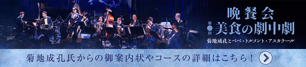 菊地成孔がプロデュースを手掛ける至高のディナー・ショウが再びコットンクラブで開催される。題して『晩餐会 / 第二回 美食の劇中劇』。将来はグランド・キャバレーの運営を行いたいとかねてより語る菊地が、“世界でも類例のない超混血系オルケスタ”ペペ・トルメント・アスカラールを率いて登場、さらに音楽家の枠を超えて料理、ドリンク、ドレスコードもトータルにプロデュース。結成20周年記念アルバム『天使乃恥部』も話題を集める楽団ペペ・トルメント・アスカラールの官能的で情熱的なサウンドと、料理、ワインのペアリングができるスペシャルなディナー・ショウ。日常を遠く離れたひとときを堪能したい。