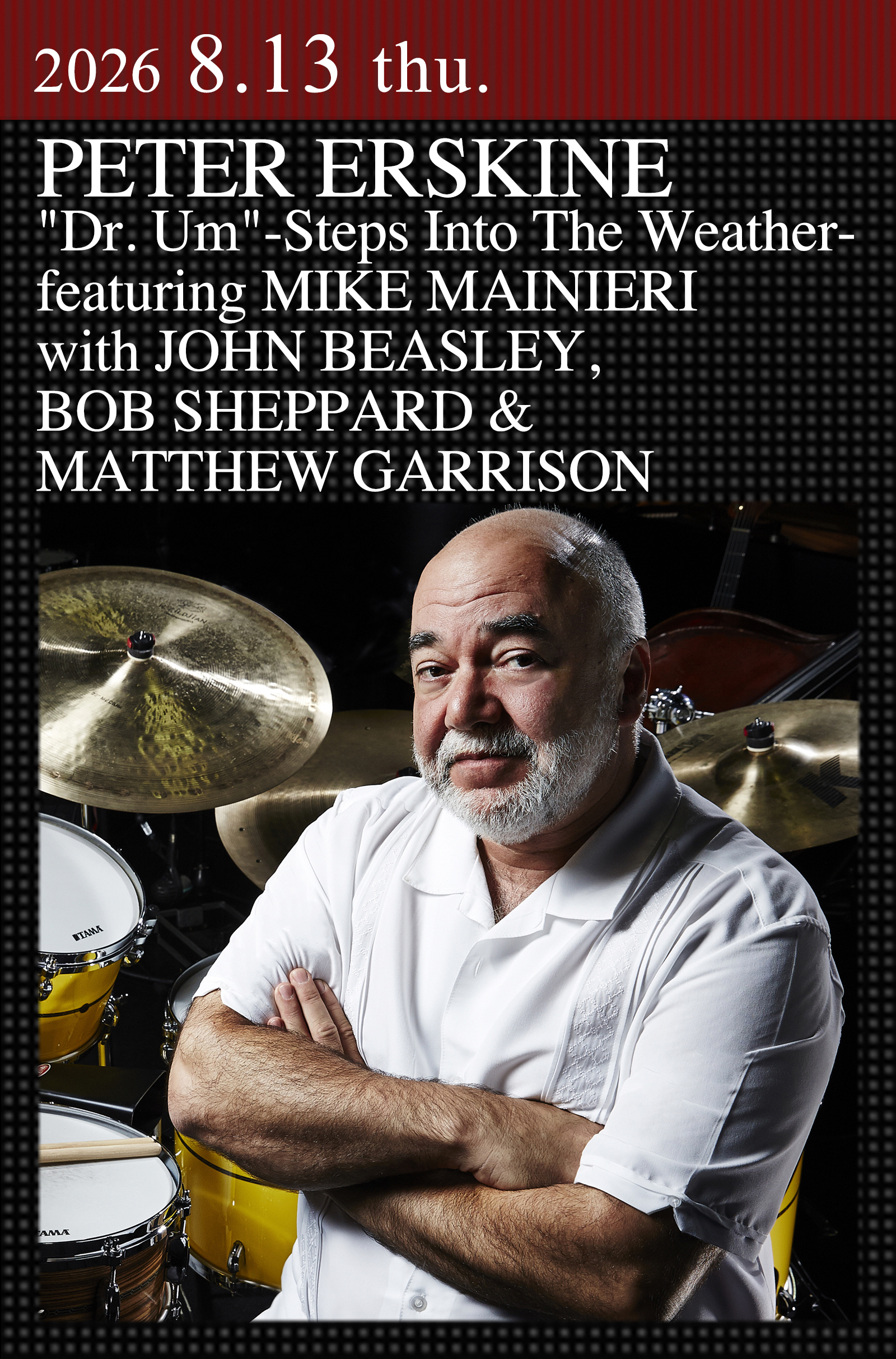 700点以上のレコーディングやサウンドトラックに携わってきたスーパー・ドラマー、ピーター・アースキンが、Dr. UM (ドクター・アム)バンドを率いて登場する。4歳でドラムを始め、メイナード・ファーガソン・オーケストラ在籍後、ウェザー・リポートでジャコ・パストリアスと鉄壁のリズム・セクションを構成。その後もステップス・アヘッド、スティーリー・ダン、自身のユニット等で精力的な活動を続けている。"Dr. UM"は、ウェザー・リポートやステップス・アヘッド時代のフュージョン、R&Bのドラムスタイルに立ち返った、アースキンの原点回帰プロジェクト。今回の公演には、マイク・マイニエリ、ボブ・シェパード、ジョン・ビーズリー、マシュー・ギャリソンというレジェンドたちが集結、伝説を蘇らせる。