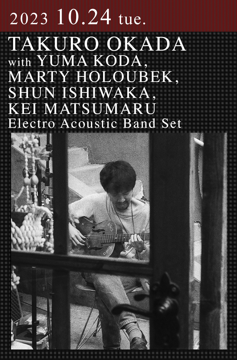2022年、約2年ぶりとなるソロ・アルバム『Betsu No Jikan』をリリース。ソングライター/ギタリスト/プロデューサーの岡田拓郎がコットンクラブで初公演を行う。2015年の“森は生きている”解散後、ソロ・アーティストとしての活動を始め、ギタリストとして優河、柴田聡子、never young beach、大貫妙子、James Blackshawなど様々なミュージシャンのライヴ/レコーディングに参加するほか、プロデューサー/ミキシング・エンジニアとしても手腕を発揮している。当公演には映画音楽の制作やファッションショーの音楽監督、舞台芸術やインスタレーションへの楽曲提供等を手掛ける香田悠真が参加。さらに、Marty Holoubek、石若駿、松丸契といった、日本のジャズ界を牽引するメンバーも揃う、この日限りの貴重なステージとなる。