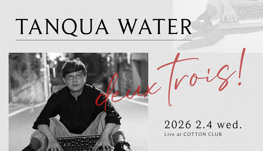 多くのファンに惜しまれつつ解散したbonobosのフロントマン・蔡忠浩が、約2年の歳月を経て結成した新バンド〈TANQUA WATER〉がコットンクラブ初登場!蔡忠浩は2003年、bonobosのヴォーカル/ギター/ソングライターとしてメジャーデビュー。高度な演奏力や飽くなき創造性、唯一無二の音楽性で高い評価を集め、バンド解散後の2023年10月からは、新宿を拠点とする音楽イベントチーム“Super Ultra FANTASIA”を始動。ここ数年はバンドやソロ活動の枠を越え、CMナレーションや舞台の音楽監督、映像への音楽提供も行なってきた。新作リリースを控えたタイミングで行われる今回の〈TANQUA WATER〉公演。bonobosとはまた異なるアプローチで展開される、現在進行形の蔡忠浩の音楽表現とバンドサウンドに注目したい。
