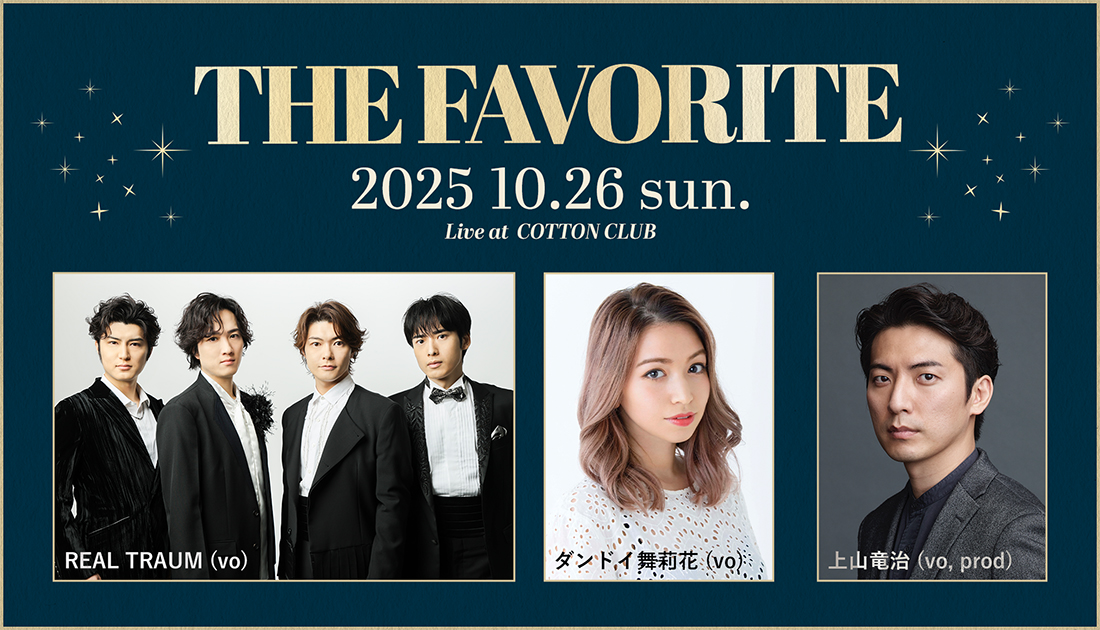 俳優・ヴォーカリストとして活動する上山竜治がプロデュースする新プロジェクト、THE FAVORITEが初のコットンクラブ公演を行う。上山は2003年に主演映画『ROUTE58』をきっかけに俳優デビュー。2004年、宮本亜門演出の『イントゥ・ザ・ウッズ』でジャック役に抜擢され、近年も『三銃士』、『刀剣乱舞』〜坂龍飛騰〜、『ハリー・ポッターと呪いの子』等の話題作に登場している。今回、共にステージを飾るのは、2023年結成のクラシカル・クロスオーバー系ユニット“REAL TRAUM”、『ジャージー・ボーイズ』など数多くのミュージカルに登場するダンドイ舞莉花。ミュージカル、オペラ、ポップスなどの分野から、それぞれの十八番ナンバーがたっぷり披露される予定。エンターテインメントの醍醐味を、クラブならではの親密な空間の中で味わいたい。