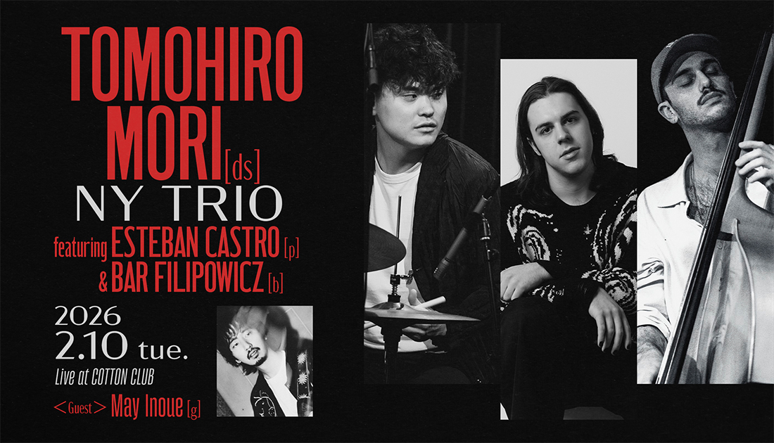 NYを拠点に活動する気鋭ドラマー、森智大が現地の注目若手ミュージシャンとともに来日し、コットンクラブに登場する。森は2015年に名門バークリー音楽大学を卒業後、拠点をNYへ移し、これまでに スモールズ、ジャズ・アット・リンカーンセンター、ミントンズ・プレイハウスなど、ニューヨークの主要ジャズクラブに出演。サード・アルバム『Prana』は米 DownBeat 誌で高い評価を獲得し、NYの歴史あるジャズ・ガイド誌 Hot House Jazz では、ニューヨークと日本のジャズ・シーンをつなぐ将来有望なアーティストのひとりとして紹介された。ピアニストのエステバン・カストロは、13歳でモントルー・ジャズ・ピアノ・コンペティションに優勝し、ジュリアード音楽院へ全額奨学金で入学。学外ではフレッド・ハーシュに師事し、カート・ローゼンウィンケル、マーカス・ミラーらとも共演している。ベーシストのバー・フィリポウィクズはニュースクールを卒業し、黒田卓也、ビリー・ハートらと共演経験を持つ。さらに今回は、ギタリストの井上銘がゲストとして参加。森は今回の公演に向けて「全曲自分のオリジナルで構成し、NYで自分がどのような活動をしているのかを少しでも伝えられたら」と語っている。NYと東京のジャズ・シーンを結ぶ、垂涎の一夜となるだろう。