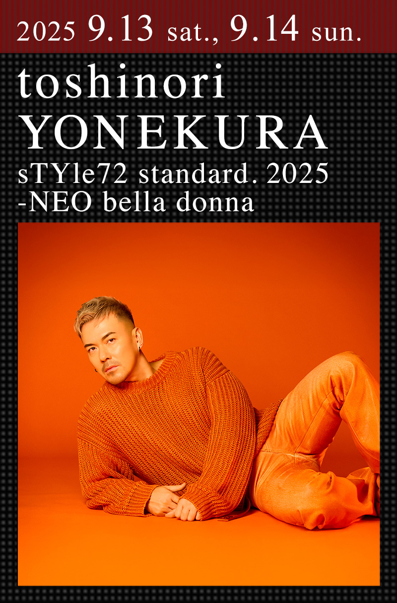 J-R&Bシーンのトップランナーとして幅広い活躍を続ける米倉利紀が恒例シリーズ「sTYle72 standard.」の東京公演を開催する。1992年にシングル「未完のアンドロイド」でデビュー。ブラック・ミュージックの影響を強く受けた音楽性でJ-POPとR&Bの橋渡しを成し遂げたヴォーカリストのひとりとして知られ、自身の楽曲はもちろん、KinKi KidsやMISIAらへの楽曲提供でも話題を集めてきた。「sTYle72 standard.」は、米倉利紀が洋邦のスタンダード楽曲のカバーを中心にお届けする人気シリーズ。その最新形となる今回のステージは、「NEO bella donna」と題し、1992年にリリースされたデビューアルバム「bella donna」を新しい形で復活させる。“変わりゆく変わらないもの”をコンセプトに、今の米倉利紀を存分に堪能できる極上の一夜となる。